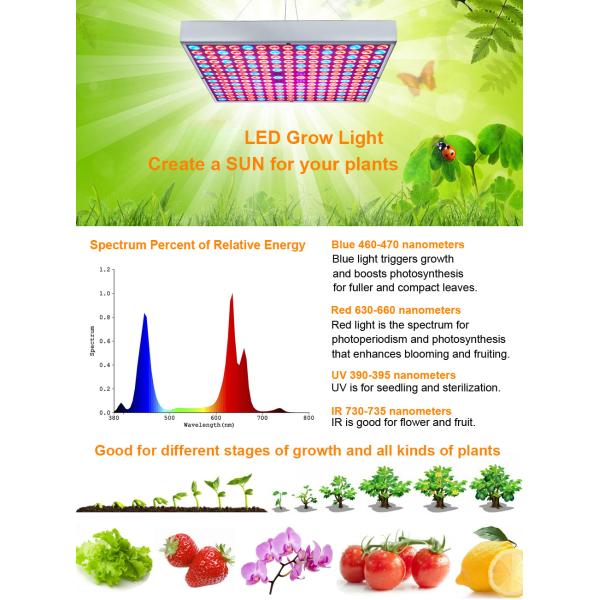 Full Spectrum LED Grow Light with Red Blue White from 390nm to 730nm, provides the targeted peak wavelength that plants most desire from sunlight. Make plants grow faster and healthier in all stages of growth.